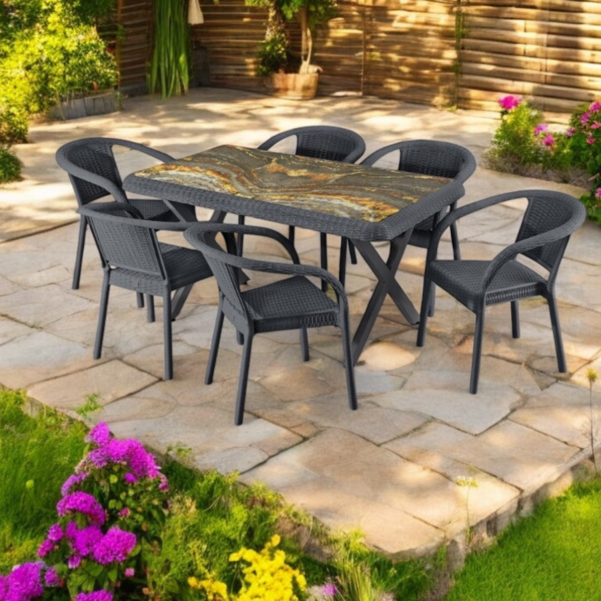 Bamboo rattan hatású műanyag kerti asztal antracit szürke, üveglappal rendkívül erős asztal amely elegáns dizájnal párosul. Antracit színben kapható. Ellenáll az időjárás viszonytagságainak, UV védett. A termék rattan hatású műanyag, így olyan külsővel rendelkezik akár egy igazi rattan asztal.Bárhová kiváló választás akár kertekbe, teraszokra, akár beltérre is.Külön ajánljuk vendéglátó helyekre, kiadó ingatlanokba, rendezvény helyszínekre, strandokra, fürdőkbe.Török termék. Tisztítása langyos vízzel, puha ronggyal történjen, az antracit szürke színű kerti asztaloknál lehetőleg minél gyakrabban, hogy a szürke por ne fakítsa el egy idő után a szép antracit szürke színt! Az Üveglap: 6 mm vastag edzett üveg. Üveglap súlya: 11 kg.