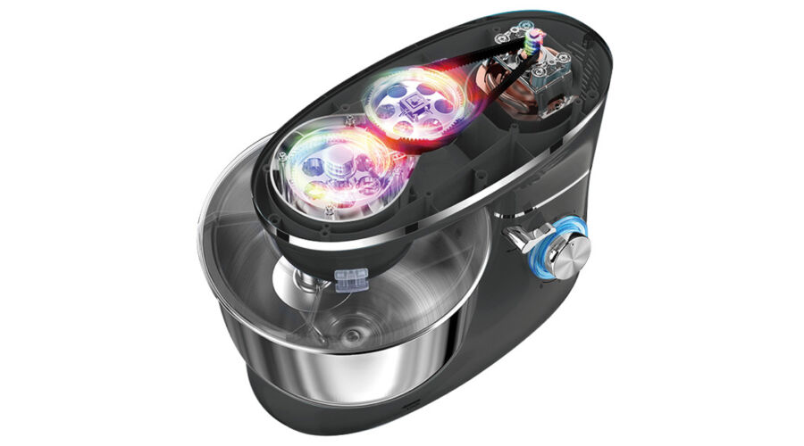 A rozsdamentes acélból készült keverőtál használat közben rögzíthető és fedő gondoskodik a biztonságos használatról.