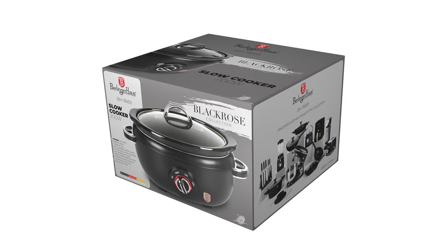 A Berlinger Haus Black Rose Collection digitális Slow Cooker kiváló minőségű kerámiából készült, levehető külső vasházzal, hőálló üveg fedővel.