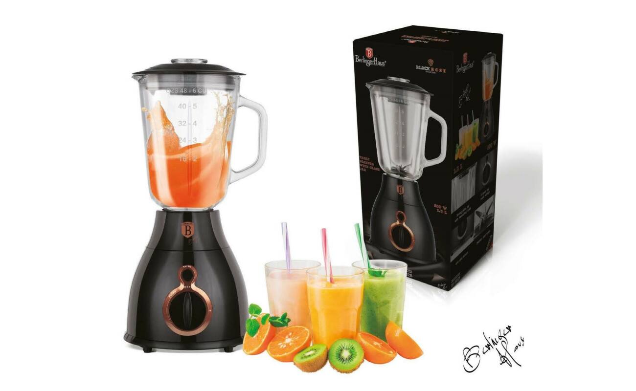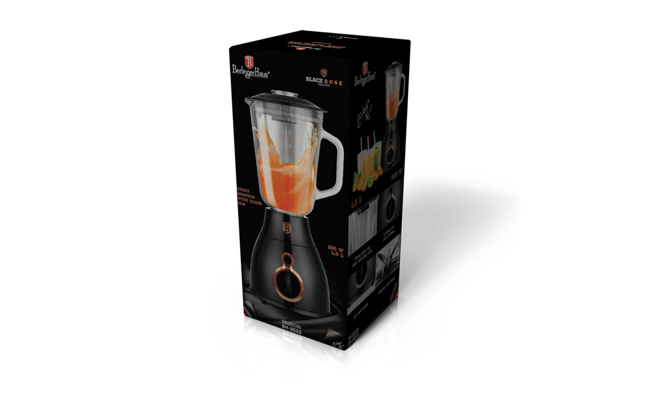 Bruttó ár: 9 990 Ft.Elfogyott!Berlinger Haus Black Rose Turmixgép üveg kancsóval 1,5 literes, 600 W, fekete/rosegold