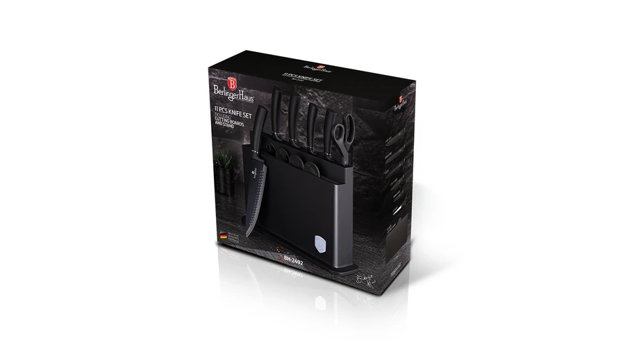 Berlinger Haus Black Silver Collection 11 részes késkészlet vágódeszkákkal és állvánnyal