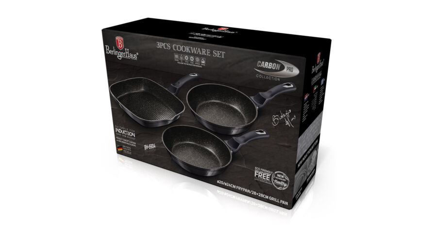 Bruttó ár: 17 290 Ft.Elfogyott!Berlinger Haus Carbon Pro Collection 3 részes serpenyőkészlet grill serpenyővel, márvány bevonattal