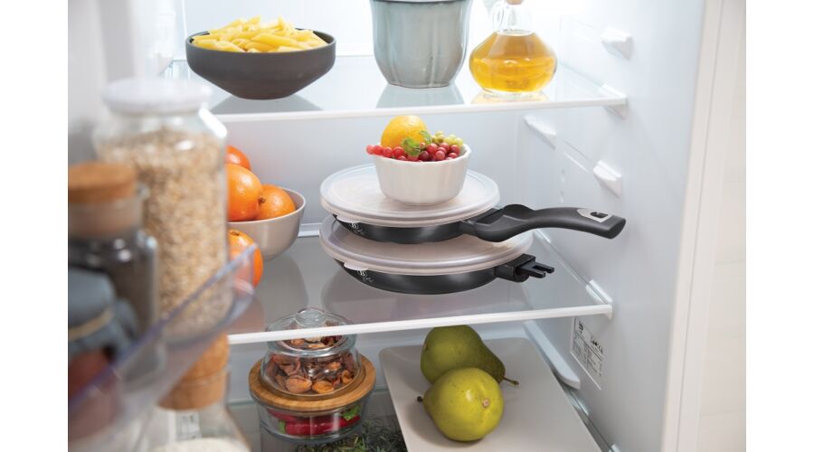 A műanyag fedőnek köszönhetően a hűtőben is helytakarékosan tárolható.