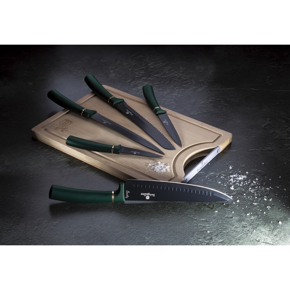 A Berlinger Haus Emerald Collection rozsdamentes acélból készült kések pengéi tapadásmentes bevonatot kaptak, antibakteriálisak, nem foltosodnak és nem tartják meg az élelmiszerek szagát.