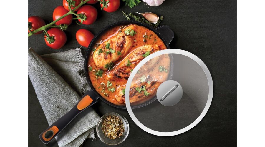 Mély serpenyő kő hatású márvány bevonattal, szilikon nyéllel, fedővel, 24 cm