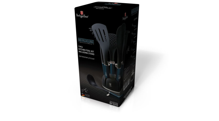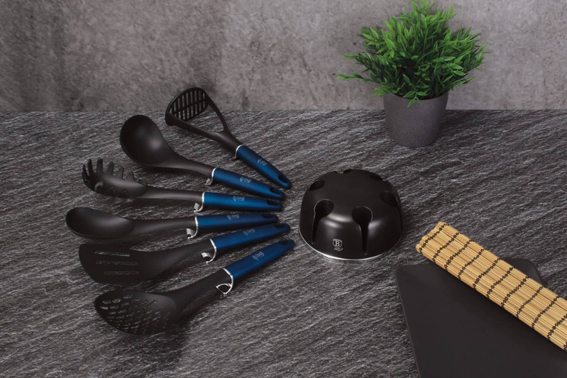 Bruttó ár: 9 100 Ft.Elfogyott!Berlinger Haus Metallic Aquamarine Line 7 részes nylon konyhai eszköz készlet állvánnyal, fekete/sötétkék