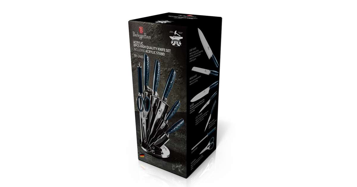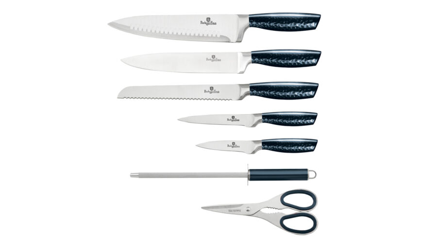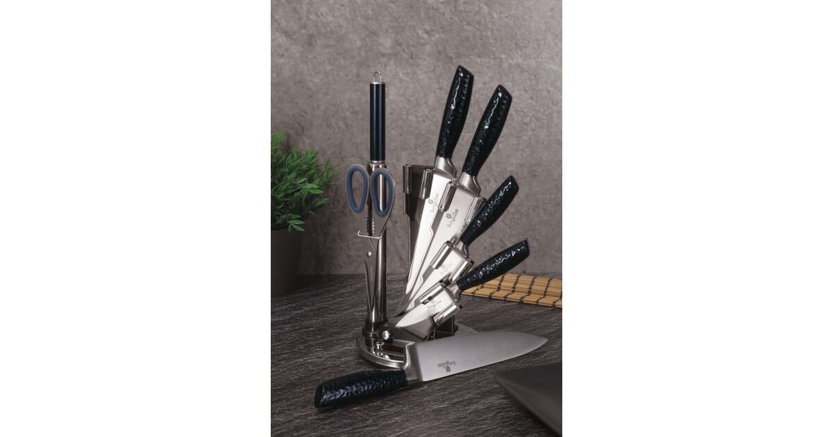 Bruttó ár: 8 990 Ft.Elfogyott!Berlinger Haus Metallic Aquamarine Line 8 részes rozsdamentes acél késkészlet állvánnyal, sötétkék metál