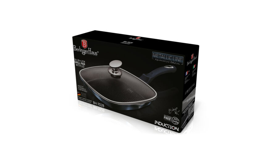 Bruttó ár: 6 890 Ft.Elfogyott!Berlinger Haus Metallic Aquamarine Line grill serpenyő fedővel, márvány bevonattal, metál külső bevonattal, 28 cm