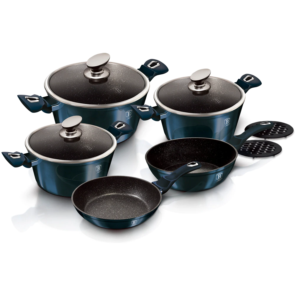 Bruttó ár: 42 190 Ft.Elfogyott!Berlinger Haus Metallic Aquamarine Line 10 részes edénykészlet márvány bevonattal, kiszedőkkel,sötétkék