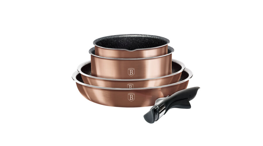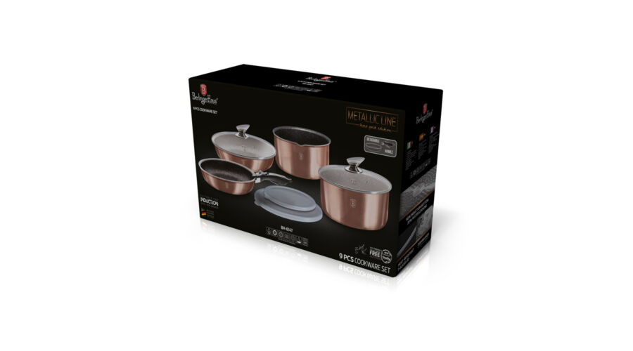 Bruttó ár: 32 890 Ft.Elfogyott!Berlinger Haus Metallic Rosegold Line 9 részes edénykészlet levehető nyéllel,márvány bevonattal, metál külső bevonattal