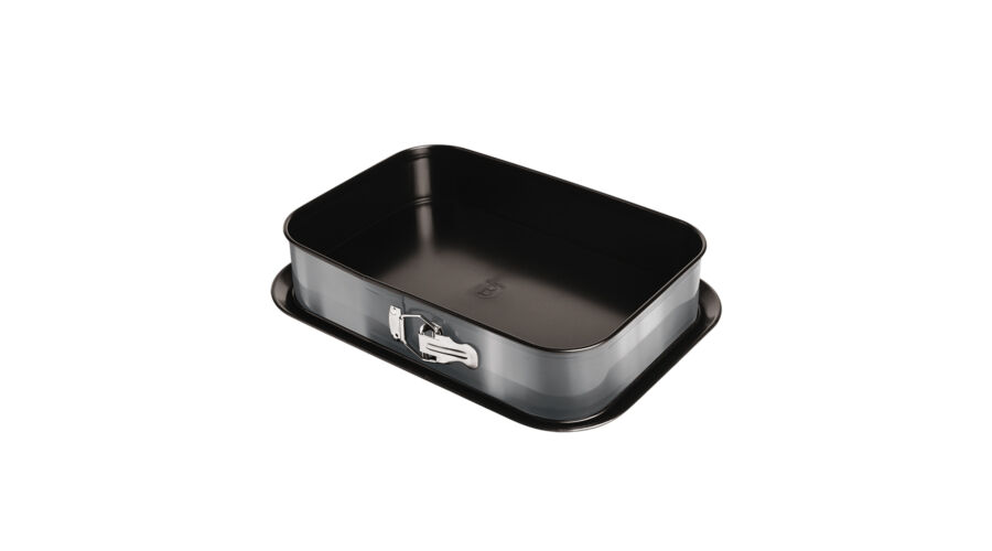 A szögletes tepsi oldala kapcsos, egyszerűen levehető a kész süteményről.