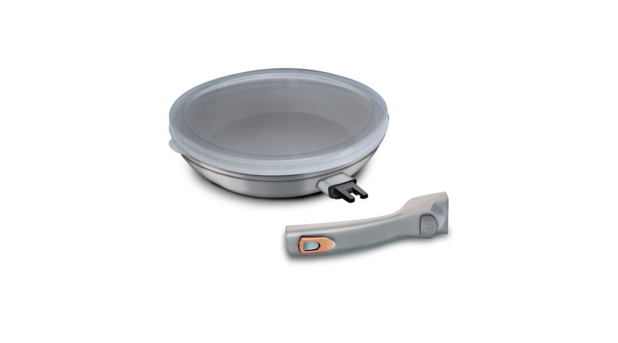 A műanyag fedő és a lekattintható nyél megkönnyíti a serpenyő tárolását hűtőben.