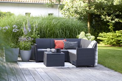 Megérkezett a Keter Claire 5 személyes kerti sarokgarnitúra szettje, amely kiváló megoldás lehet erkélyekre, teraszokra, de akár a kertjébe is. Rattan hatású műanyag kerti szett. A kényelmet a szettben lévő párnázat biztosítja. Tárolós asztallal, így a párnákat tárolhatja a kis tárolós asztalban is ha éppen nem használja, vagy ha rossz az időjárás. Könnyen összeszerelhető. Könnyen tisztítható. Ellenáll az időjárás viszonytagságainak.