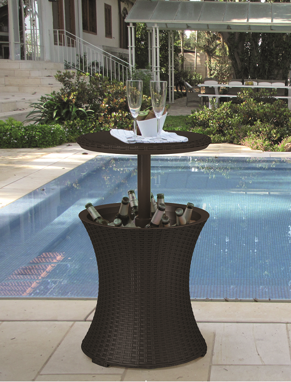 Cool Bar Rattan műanyag kerti asztal, mely összecsukva dohányzóasztal, kinyitva viszont a belseje italok tárolására és hidegen tartására használható. whiskey barna színben. - Curver 17194548 - 230902