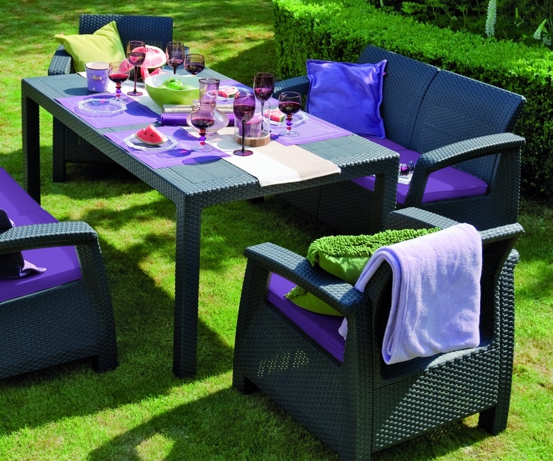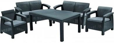 Corfu Fiesta 6 személyes, rattan hatású műanyag kerti bútor garnitúra, mely tartalmaz 2 db kétszemélyes kanapét ülőpárnákkal, 2 db fotelt ülőpárnákkal, és 1 db nagy méretű asztalt. grafit - hűvös szürke színkombináció. - Curver 17198008 - 223216