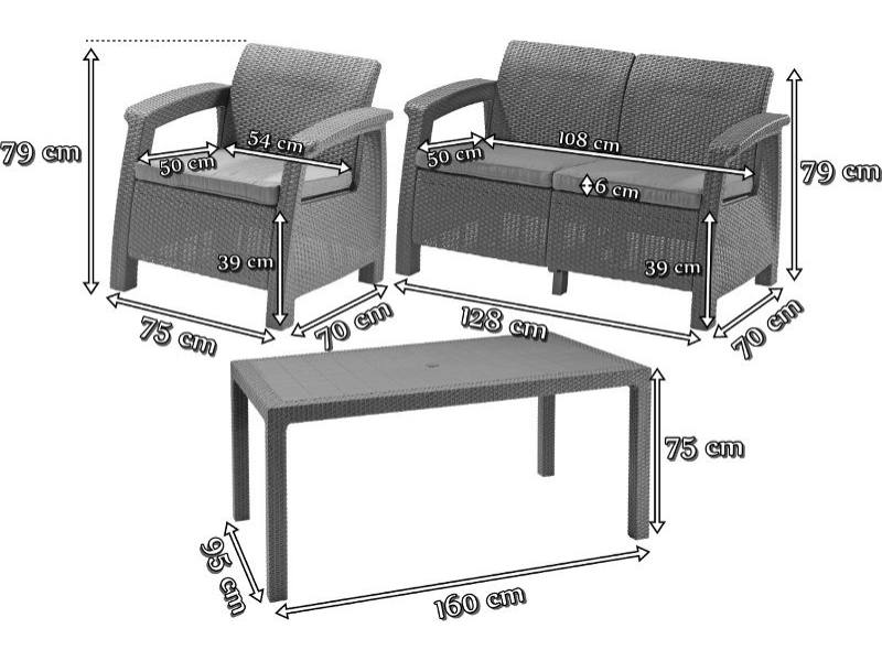 Corfu műanyag rattan hatású kerti bútor garnitúra, mely tartalmaz 1 db kétszemélyes kanapét ülőpárnákkal, 2 db fotelt ülőpárnákkal és 1 db dohányzó asztalt. grafit - hűvös szürke színkombináció. - Curver 17197361 - 223204