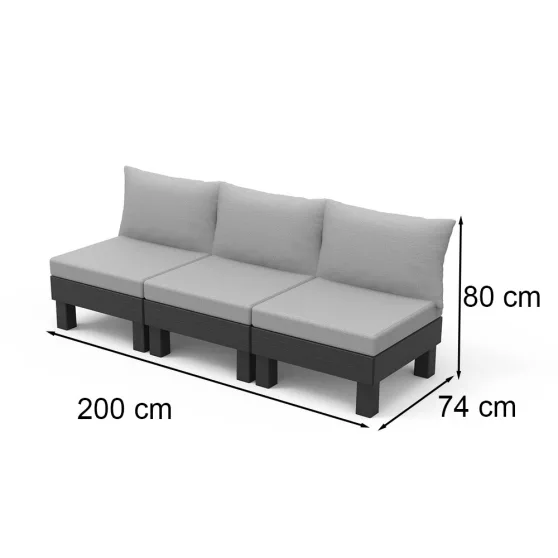 Méretei: – 200 cm szélesség, 74 cm mélység és 80 cm magasság – így ideális kisebb erkélyekre, teraszokra is. A robusztus szerkezet és a kiváló minőségű anyagok biztosítják, hogy a kanapé tartós és időjárásálló legyen.