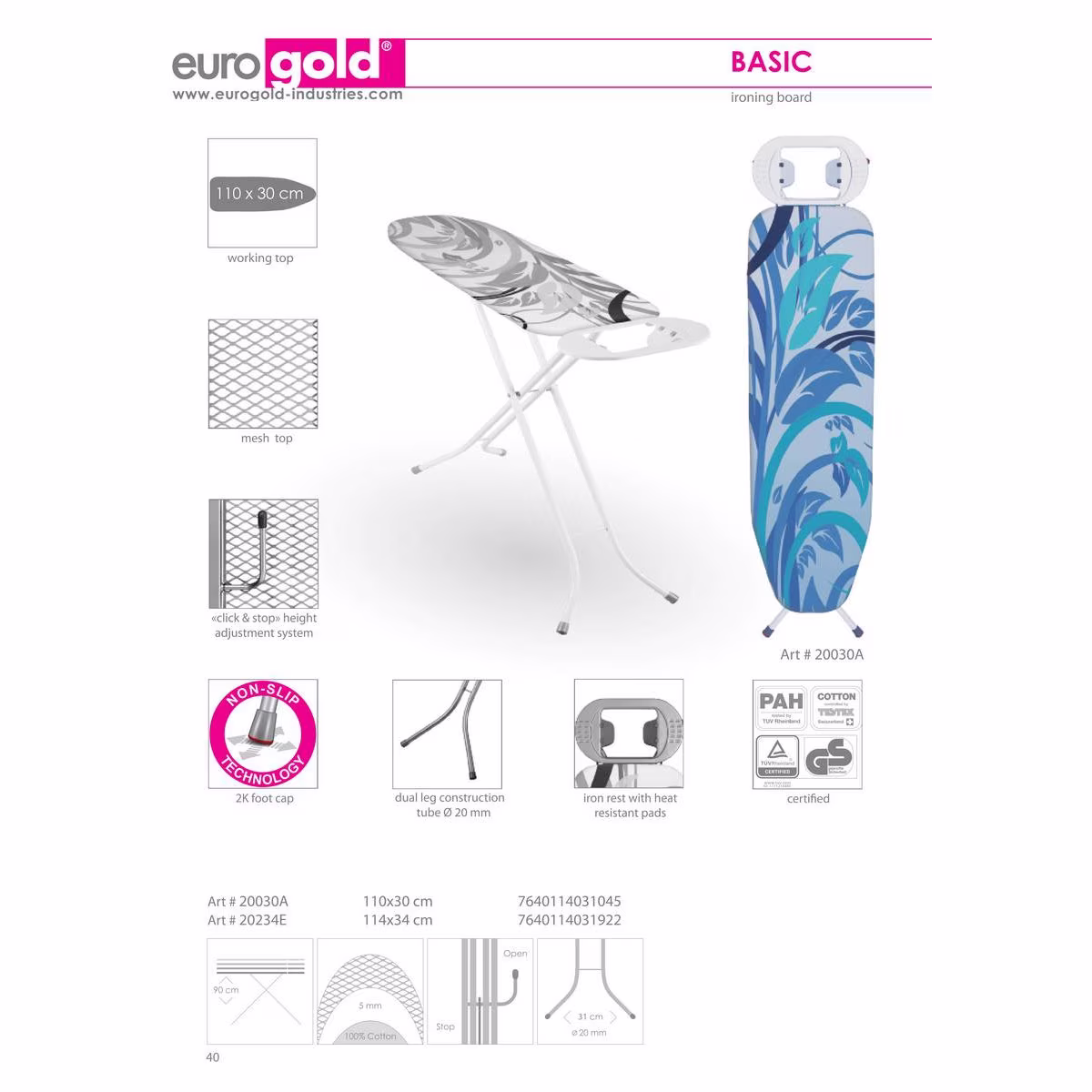 Eurogold vasalóállvány, 110 x 30 cm-es méretben, pamut huzattal.