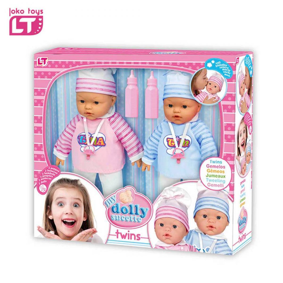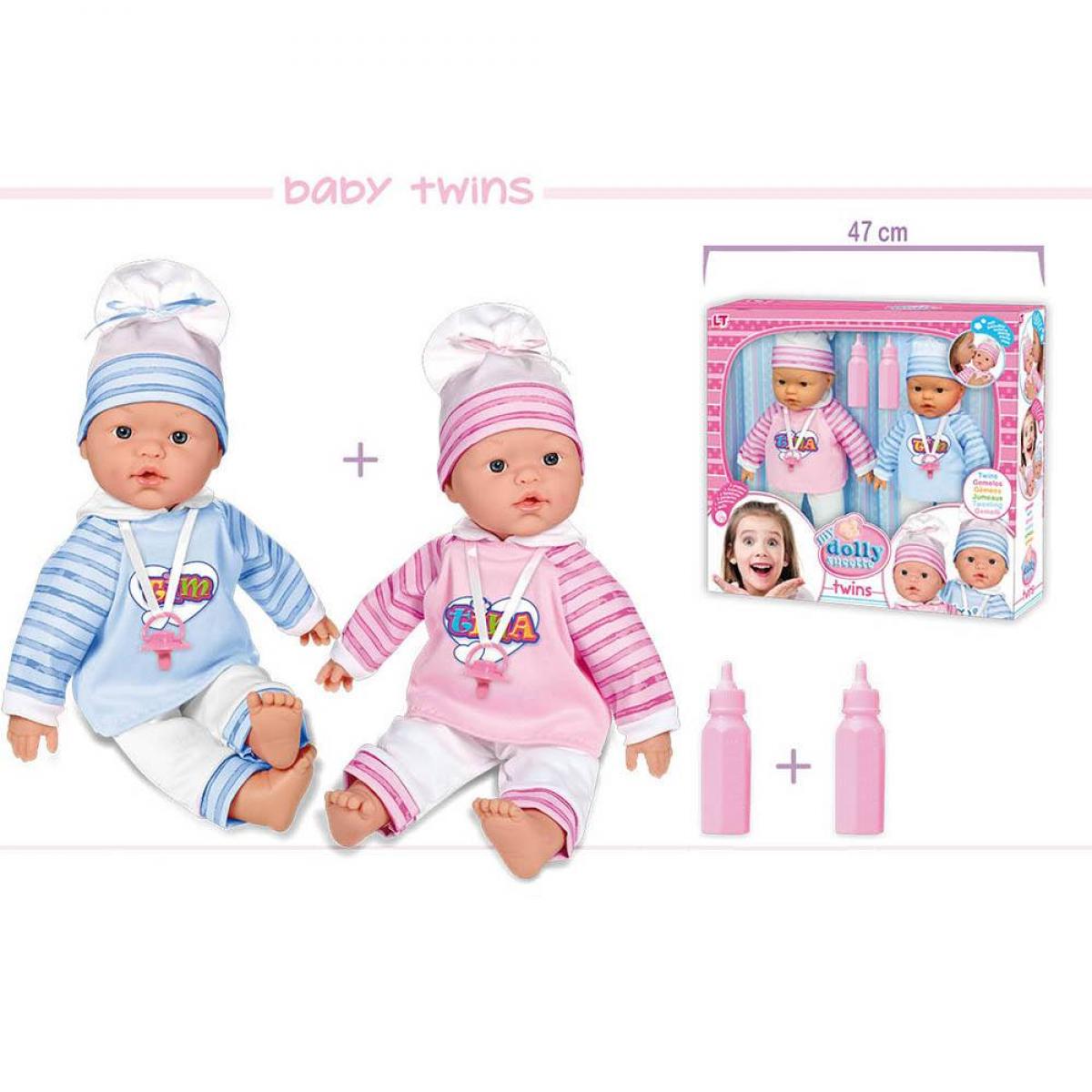 A készlet tartalma: 2 db baba, 2 db játék cumi, 2 db játék cumisüveg. Anyaguk műanyag és textil. A babák mérete: 37 cm. A csomagolás mérete: 13 x 46 x 42 cm. Élénk rózsaszín, kék és fehér színeik vidámságot sugároznak. 10 hónapos kortól ajánlottak.