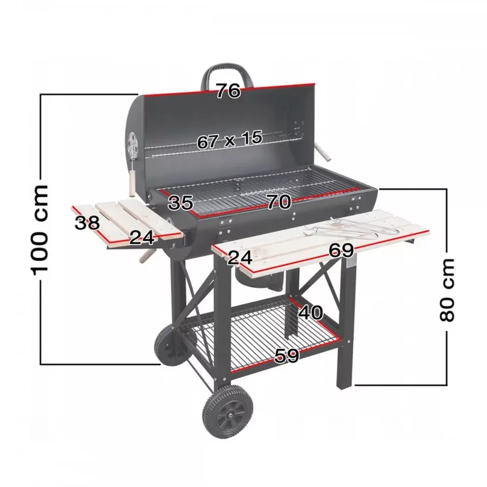 A nagyméretű grill hengeres és zárható fedéllel rendelkezik. A faszéngrill fedele hőmérővel rendelkezik, és képes a levegő áramlásának beállítására, ami lehetővé teszi az ételek tökéletes elkészítését. Funkcionális előny az összecsukható fa polcok és az alsó rács, amelyek megkönnyítik a grillezést és a praktikus kiegészítők tárolását.