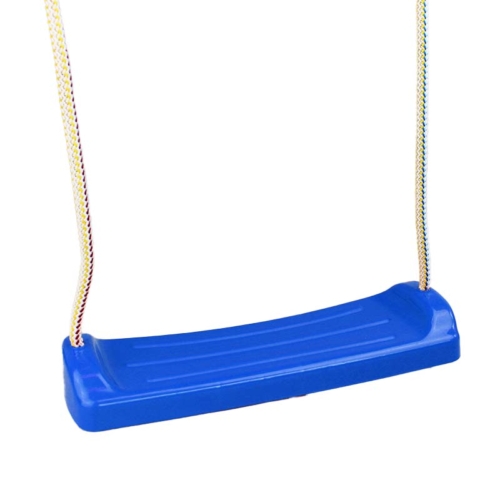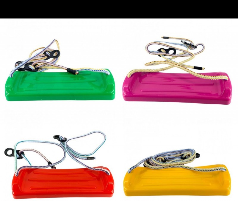Színes fa gyermek hinta a felfüggesztéshez szükséges kötélzettel és fém rögzítő karikákkal.