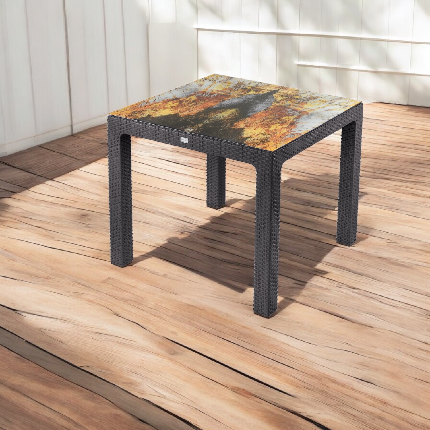 Műanyag rattan hatású barna kerti asztal színes üveglappal