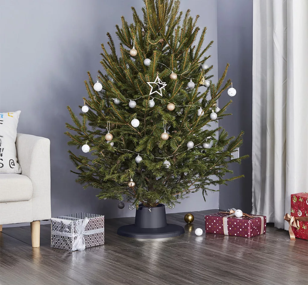 Minimalista, letisztult karácsonyfatalp, ami nagyon kevés helyet foglal a fa alatt, bőséges helyet hagyva az ajándékoknak.