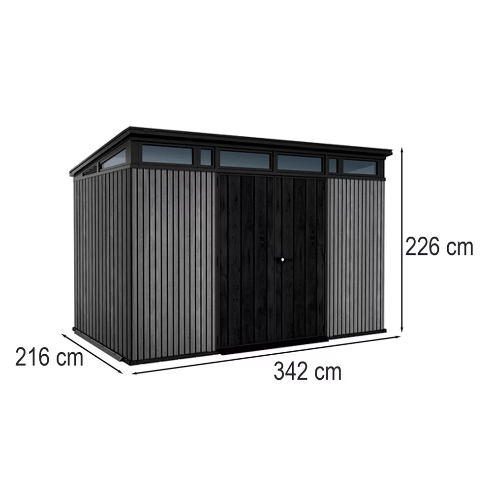 A Signature PENT 11x7 kerti ház ötvözi az esztétikát és a funkcionalitást. A ferde tető és letisztult vonalvezetés tökéletesen illeszkedik a modern kertépítési trendekhez, míg a kőrisfa színű DECOCOAT technológia időjárásálló felületet biztosít.