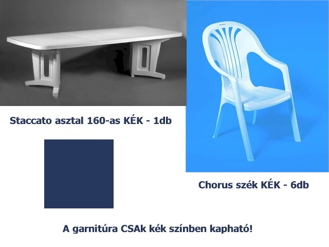 Staccato műanyag kerti étkező bútor garnitúra KÉK színben, mely tartalmaz 1 db műanyag 160 cm-es kék színű Staccato kerti asztalt és 6 db Chorus műanyag magastámlás, karfás, kék színű kerti széket. A garnítúra minden eleme Flair márkatermék!