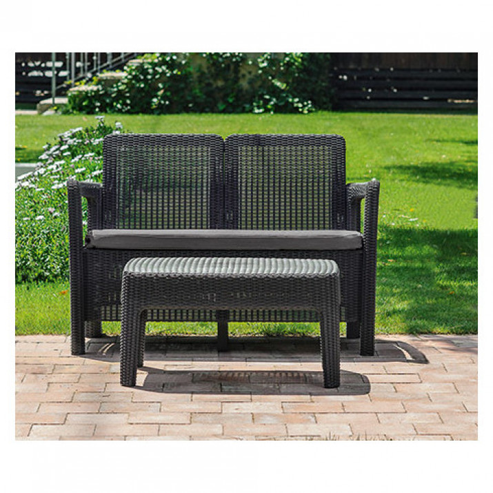 Bruttó ár: 174 990 Ft.Elfogyott!Emily műanyag kerti bútor garnitúra teraszra, mely tartalmaz 1 dohányzó asztalt, 2 széket és egy 2 személyes padot. Curver-246589