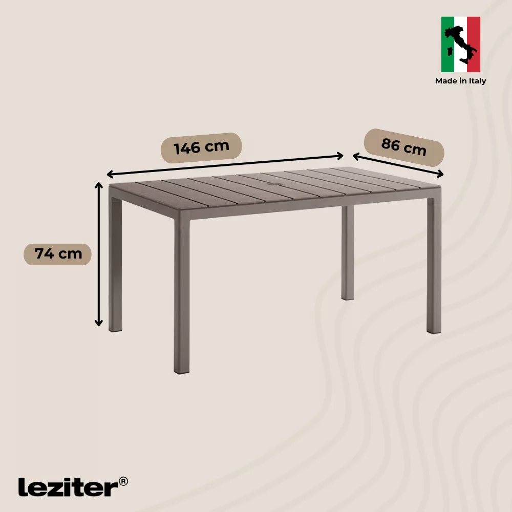 A Tulsa műanyag kerti asztal 146 x 86 x 74 cm-es méretével ideális választás 6 személy számára. Kompakt, mégis tágas, így nem foglal sok helyet, de elegendő teret biztosít egy kényelmes kültéri étkezéshez vagy baráti összejövetelhez. A modern cappuccino színű, időtálló műanyagból készült, így nem kell aggódnod a fakulás, a rozsda vagy a vízkárok miatt. Az UV-védelem gondoskodik arról, hogy hosszú éveken át megőrizze eredeti kinézetét, míg a könnyen tisztítható felület egyszerűvé teszi a mindennapi karbantartást.
