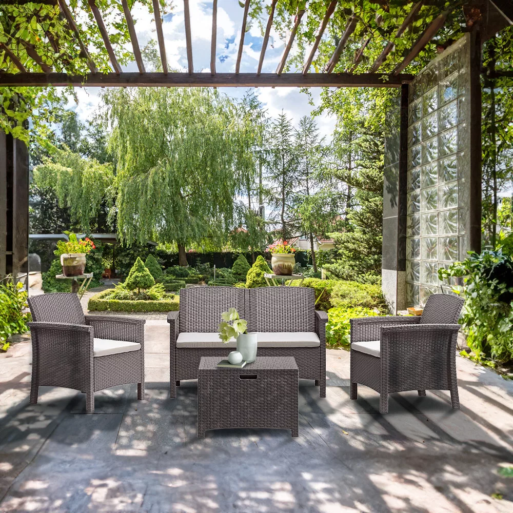 Ez a 4 személyes műrattan kerti bútor garnitúra számos előnnyel rendelkezik. Az elemei kényelmesek, praktikusak, és könnyen kezelhetők. Az anyagok tartósak és időjárásállók, így hosszú élettartamot biztosítanak, és nem kell aggódnod a karbantartás miatt. A kis méretű kis asztal kényelmesen elfér középen, és lehetővé teszi az italok és ételek elhelyezését, így még kényelmesebbé teszi a szabadtéri pihenés