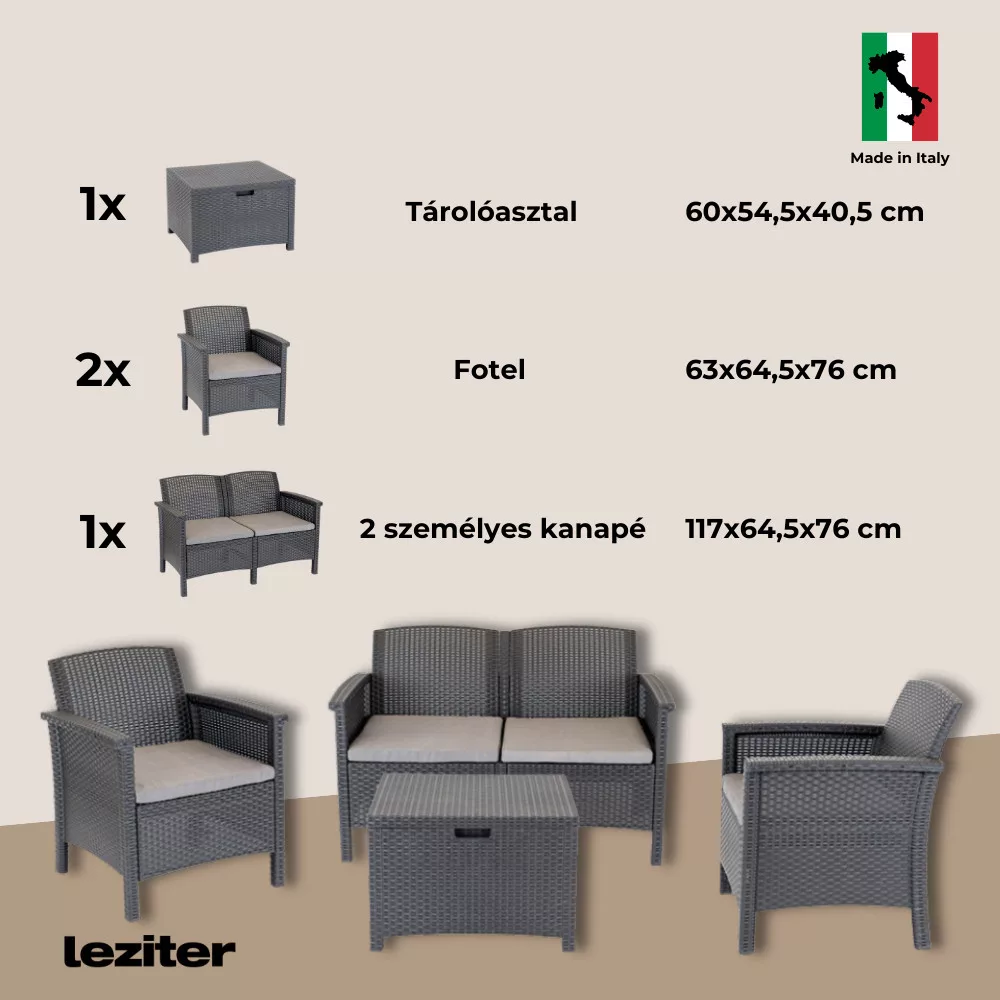 Az Olaszországban gyártott Venus 4 személyes cappuccino színű rattan kerti bútor szett egy praktikus és elegáns választás kültérre és beltérre egyaránt. A bútorszett tartalmaz két darab 63 x 64,5 x 76 cm-es kényelmes fotelt, egy 2 személyes 117 x 64,5 x 76 cm-es kanapét, valamint egy négyszögletű 60 x 54,5 x 40,5 cm-es asztalt, amely tökéletes helyet biztosít a szabadtéri beszélgetéseket, snack elfogyasztásához, vagy kényelmes kikapcsolódáshoz barátokkal és családdal.