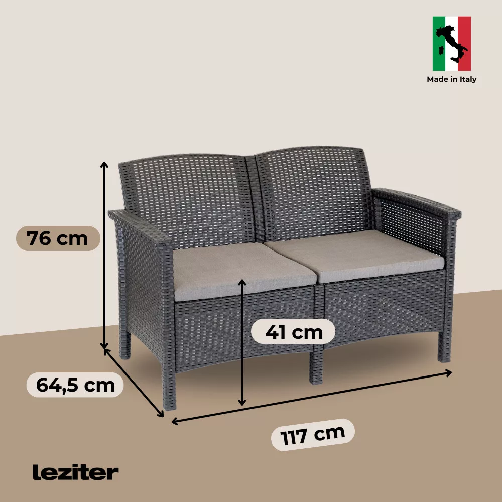 Az Olaszországban gyártott Venus 4 személyes grafit színű rattan kerti bútor szett egy praktikus és elegáns választás kültérre és beltérre egyaránt. A bútorszett tartalmaz két darab 63 x 64,5 x 76 cm-es kényelmes fotelt, egy 2 személyes 117 x 64,5 x 76 cm-es kanapét, valamint egy négyszögletű 60 x 54,5 x 40,5 cm-es asztalt, amely tökéletes helyet biztosít a szabadtéri beszélgetésekhez, snack elfogyasztásához, vagy kényelmes kikapcsolódáshoz barátokkal és családdal.